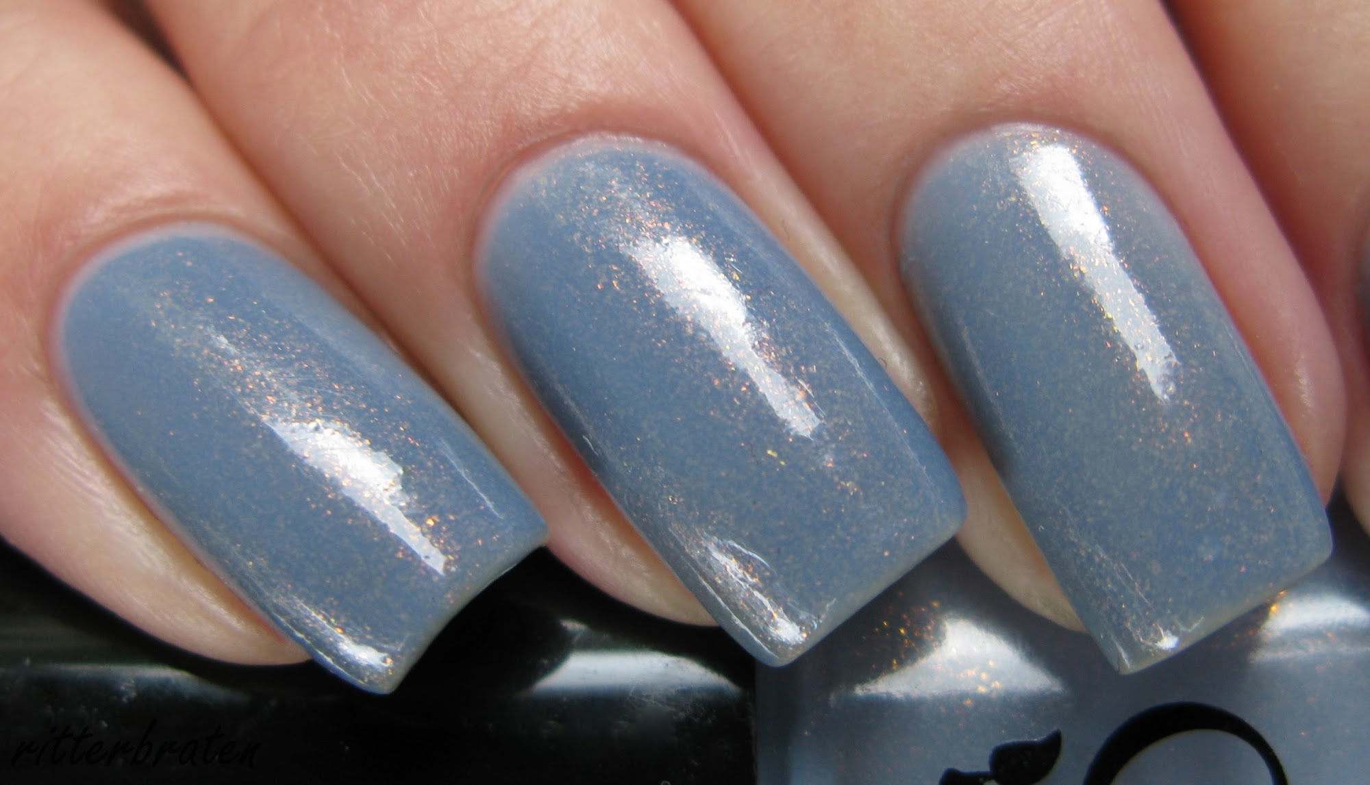 Bogota has a muted dusty greyish-blueish jelly base complemented by golden shimmer. The texture is semi-sheer and light, the coverage in 2 coats gives a decent opacity though. If you don't want the 'tip wear effect' which is so common for jelly polishes, you have to polish your nail tips well, also from the ridges.